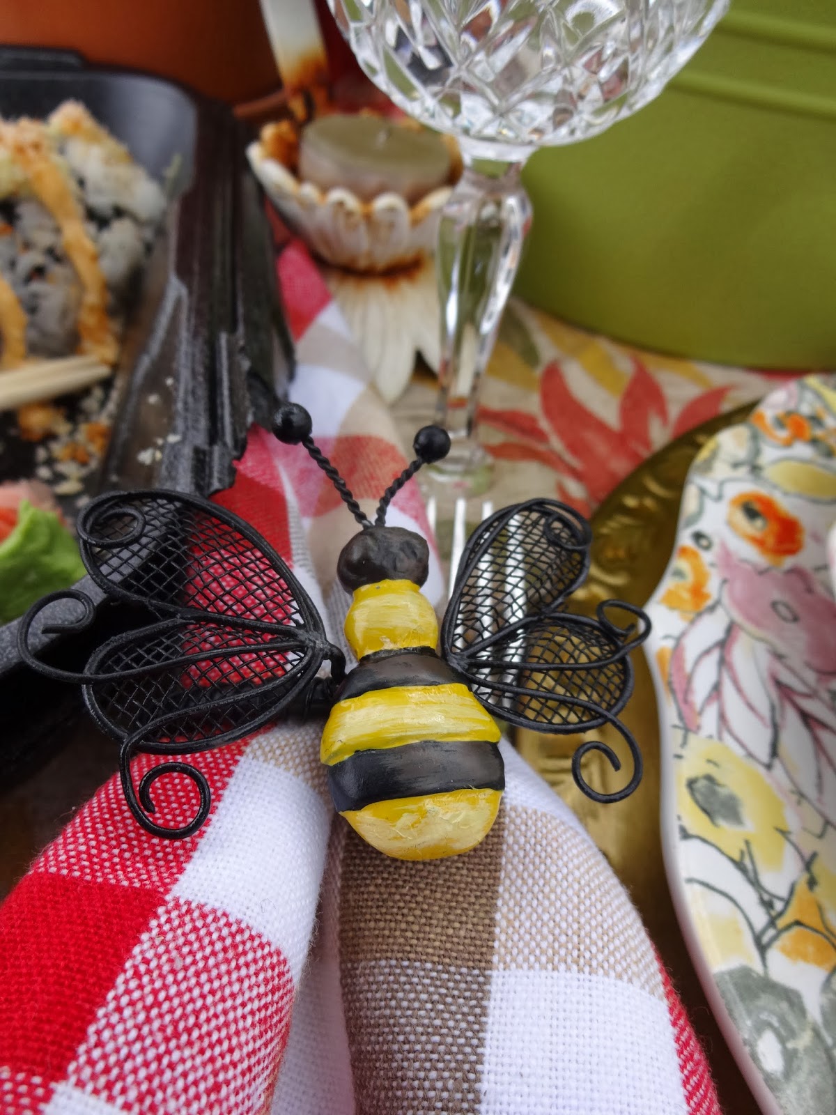 I thought my bee napkin rings would be fun to use in this garden setting.