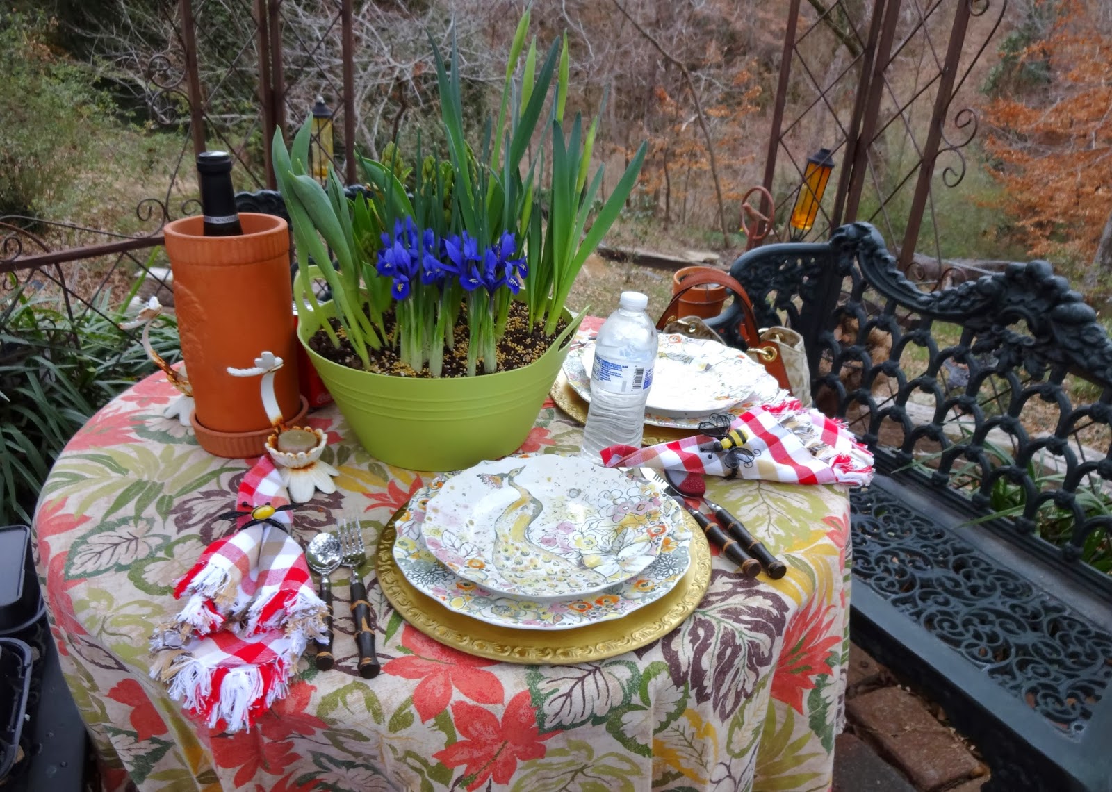 How lovely Chris, I love your gazebo and the dishes are beautiful with the peacocks. I totally love the cute bee-napkin holders, it looks like spring is coming soon! Looks like fun!